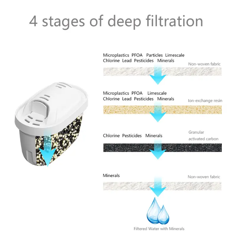 | Product Feature: | 1. Replacement pitcher water filter, 4 stages deep fitration to achieve the effect of deep filtering water: